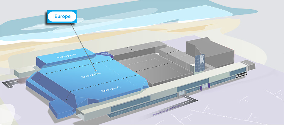 Utilisée dans sa totalité ou en espaces divisés, la salle Europe relève chaque jour le défi d'être un lieu ouvert à tous les types d'événements (concerts, séances plénières de congrès, salons, repas assis, manifestations sportives...) grâce à ses gradins amovibles permettant une multitude de configurations et de jauges.